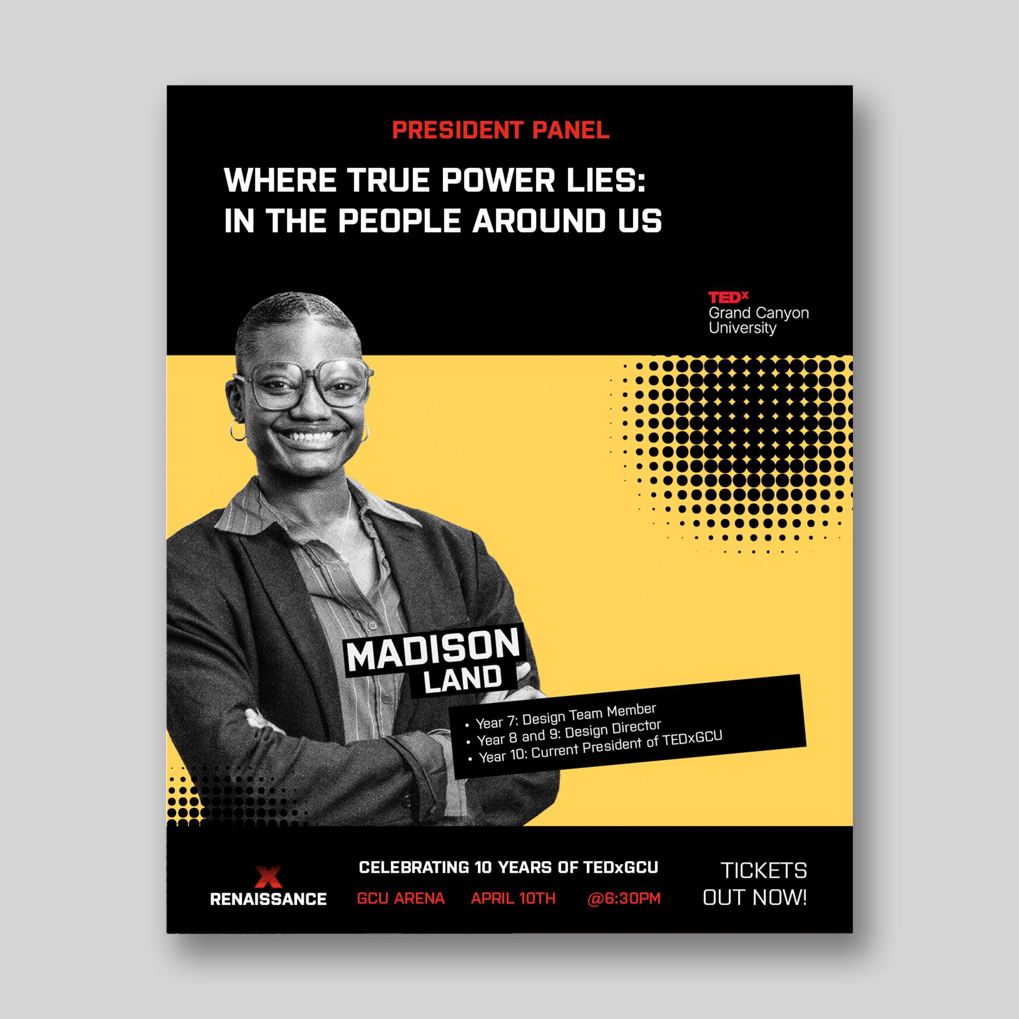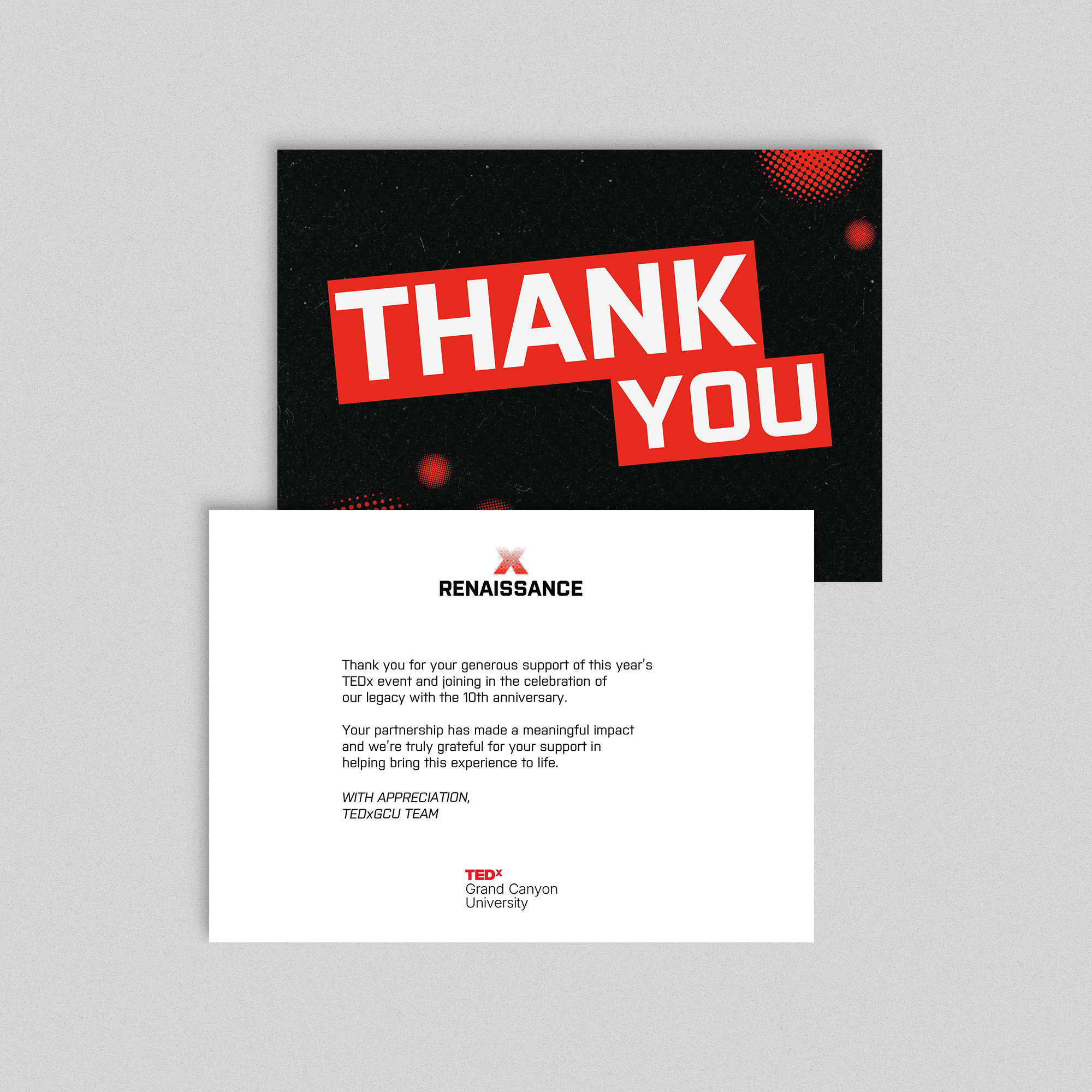 "Working with Canyon Creative was nothing short of an amazing experience. When I communicated my vision for TEDxGCU’s 10th Anniversary Main Event, I knew I wanted something that honored the legacy of students who, for the last 10 years, brought innovative ideas from great minds to GCU’s campus, while simultaneously welcoming the next era of TEDxGCU and all the innovation that will come from this Renaissance. And let me tell you, they delivered, and it did it better than I could have imagined. They were able to take the vision of not only myself, but the team and create a visual identity that was fresh, honoring, and still felt like TEDxGCU with the level of quality that they executed every single deliverable with. Their professionalism was through the roof." - Madison Land, TEDxGCU President